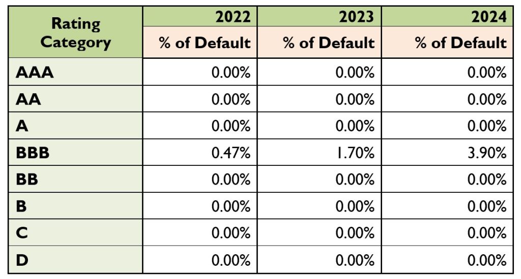 Above table indicates that, in 2022 no default at AAA to A rating notch, and default rate at BBB at 0.47% (1 entity downgrade to from BBB to BB of 239 entities). In 2023, no default at AAA to A rating notch, and default rate at BBB at 1.70% (4 entities downgrade to from BBB to BB of 240 entities). In 2024, no default at AAA to A rating notch, and default rate at BBB at 3.90% (8 entities downgrade to from BBB to BB of 205 entities).